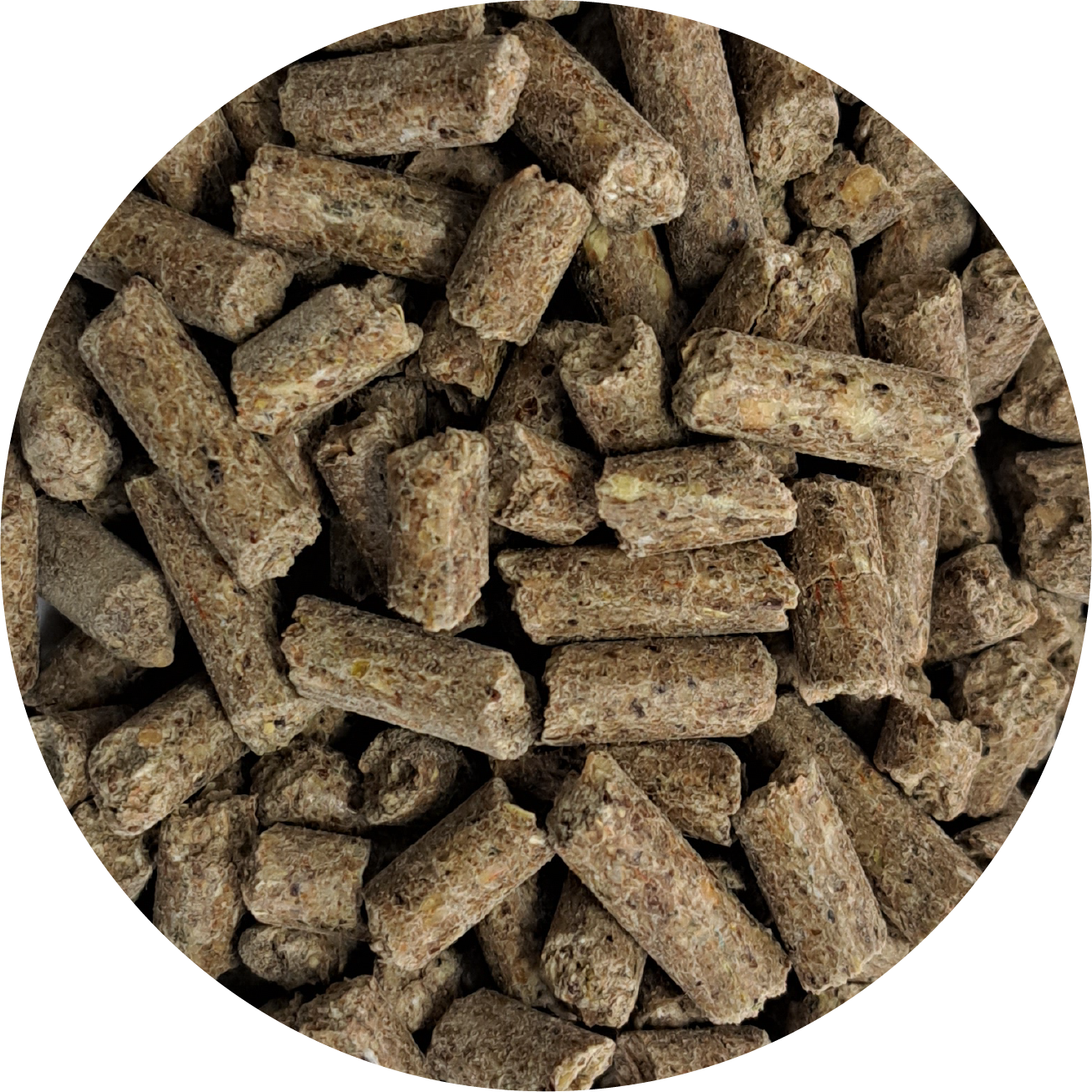 otręby pszenne, śruta poekstrakcyjna z nasion słonecznika, otręby ryżowe, poekstrakcyjna śruta sojowa, miazga jabłkowa suszona, łuski z nasion soi, lucerna suszona, makuch z siemienia lnianego, węglan wapnia, melasa buraczana, wapienne algi (lithothamne), chlorek sodu, tlenek magnezu, olej sojowy, ziele pokrzywy 0,5%, jagody rokitnika 0,1%