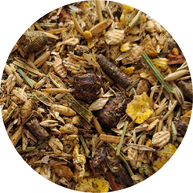 SKŁAD: płatki jęczmienne mikronizowane, płatki kukurydziane mikronizowane, lucerna suszona, miazga jabłkowa suszona, otręby pszenne, wysłodki buraczane, melasa buraczana, marchew suszona, susz z kwiatów konopi siewnej z naturalną zawartością CBD, olej rzepakowy, makuch z siemienia lnianego, ziele melisy, olej lniany, chlorek sodu, węglan wapnia, fosforan jednowapniowy, liść babki lancetowatej, nasiona kozieradki, kwiat nagietka, tlenek magnezu, czerwone wapienne algi (lithothamne)