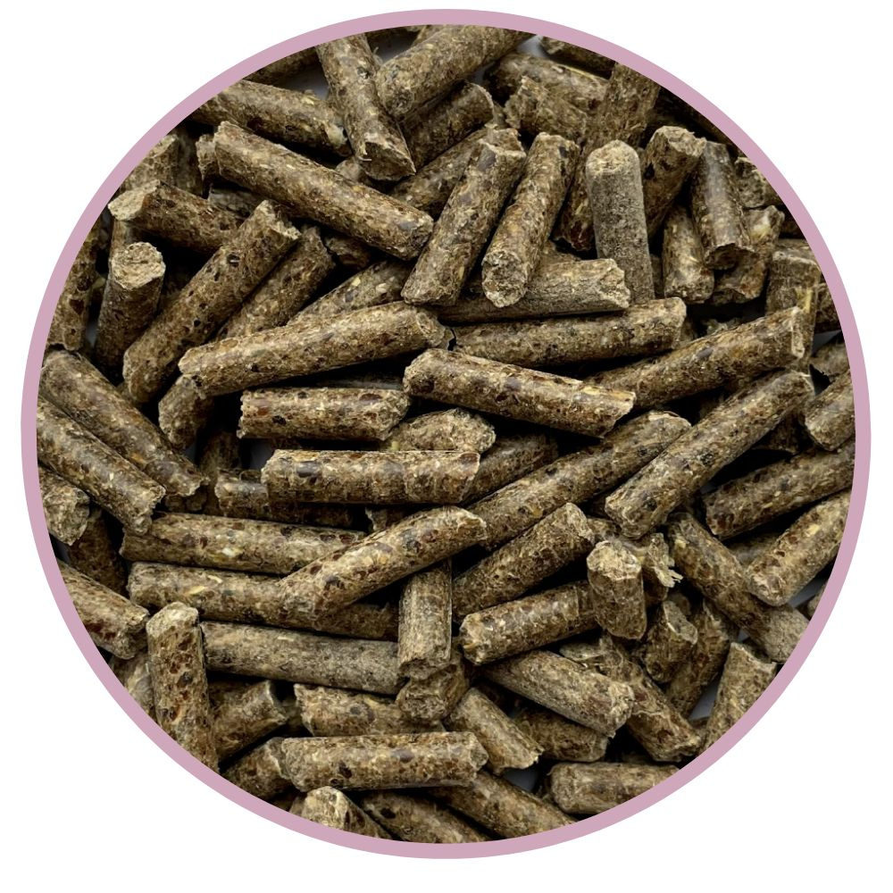 miazga jabłkowa suszona, otręby pszenne, łuski nasion soi, łuski owsiane, susz z traw, kukurydza, jęczmień pełnoziarnisty, makuch z siemienia lnianego, poekstrakcyjna śruta z nasion słonecznika, melasa buraczana, chleb świętojański suszony, czerwone wapienne algi (lithothamne), chlorek sodu, olej sojowy, olej lniany (Omega 3 i 6), skrzyp polny 0,5%, pokrzywa 0,5%, tlenek magnezu, węglan wapnia, fosforan jednowapniowy, metolosulfonylometan (MSM) 500mg