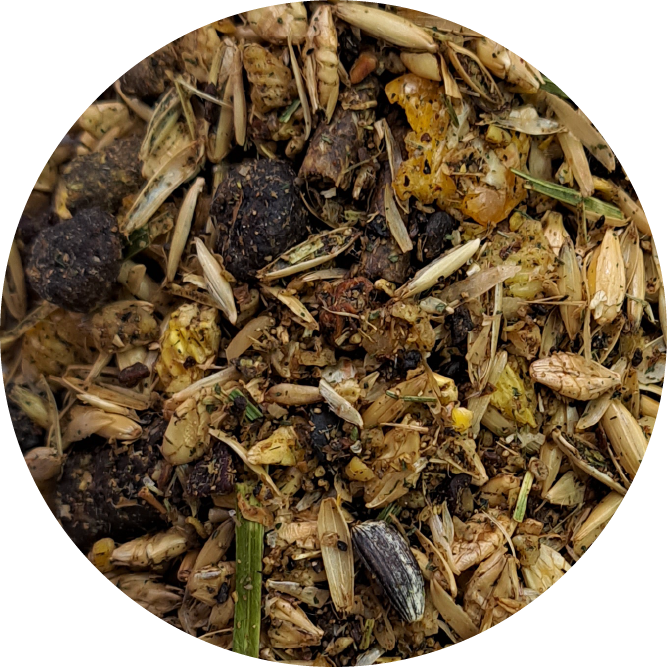 SKŁAD: płatki jęczmienne mikronizowane, miazga jabłkowa suszona, płatki kukurydziane mikronizowane, otręby ryżowe, lucerna suszona, otręby pszenne, olej rzepakowy, płatki nasion soi, melasa buraczana, fosforan jednowapniowy, marchew suszona, nasiona słonecznika, burak czerwony, pasternak, topinambur, chlorek sodu, kwiat nagietka, nasiona kozieradki, liść babki lancetowatej, węglan wapnia, tlenek magnezu, czerwone wapienne algi (lithothamne)