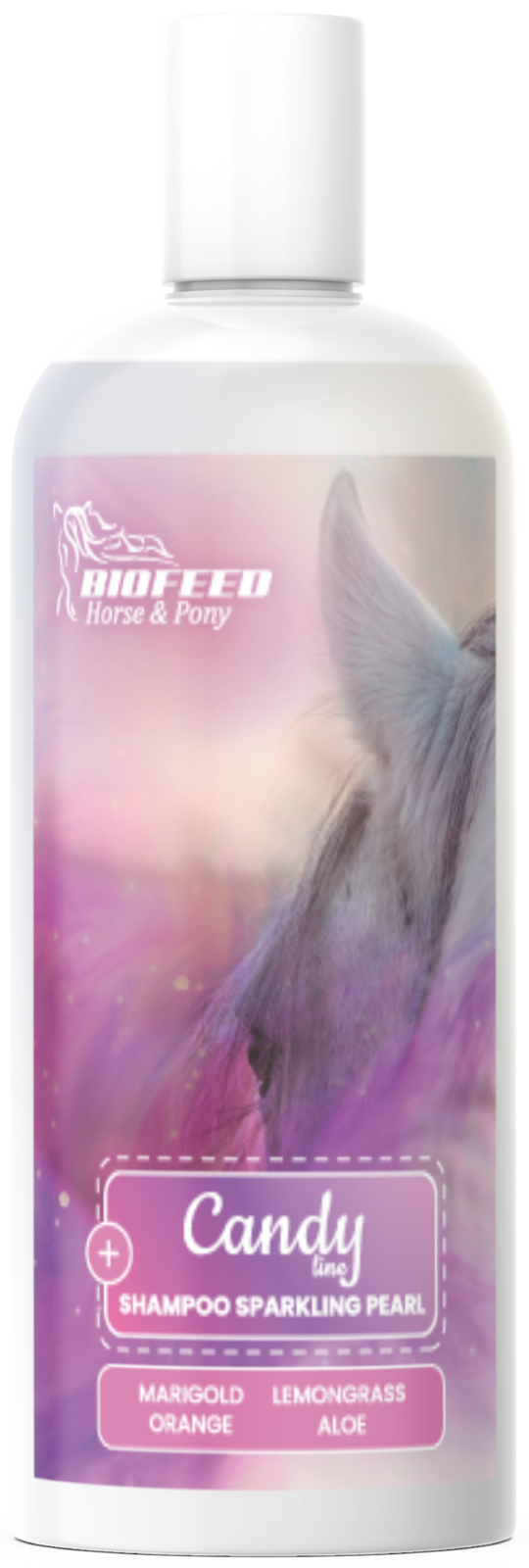 Perłowy szampon dla koni z sokiem z liści aloesu, ekstraktem z kwiatu nagietka lekarskiego olejku z liści trawy cytrynowej i wyciągu z owoców pomarańczy: