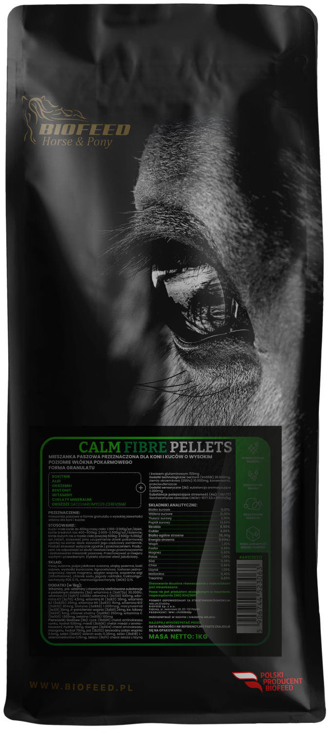 Kuce i małe konie do 400 kg masy ciała: 1000-2000 g/szt./dzień, konie średnich ras 400-600 kg: 2000-3500 g/szt./dziennie, konie dużych ras o masie ciała powyżej 600 kg: 3.500g – 5.000g/szt./dzień. Stosować jako uzupełnienie dawki pokarmowej opartej na sianie i/lub pastwisku, którego ilość minimalnie powinna wynosi 1,5% masy ciała konia, najkorzystniej – do woli. Calm Fibre może stanowić częściowy zamiennik paszy objętościowej. Dostosuj ilość paszy treściwej do obciążenia pracą, kondycji i stanu zdrowia zwierzęcia. Porcję dzienną paszy treściwej podziel na 2 lub 3 posiłki w ciągu dnia. Nie przekraczaj 2kg paszy treściwej na jedno karmienie. Upewnij się, że Twój koń ma zapewniony stały dostęp do czystej i świeżej wody.