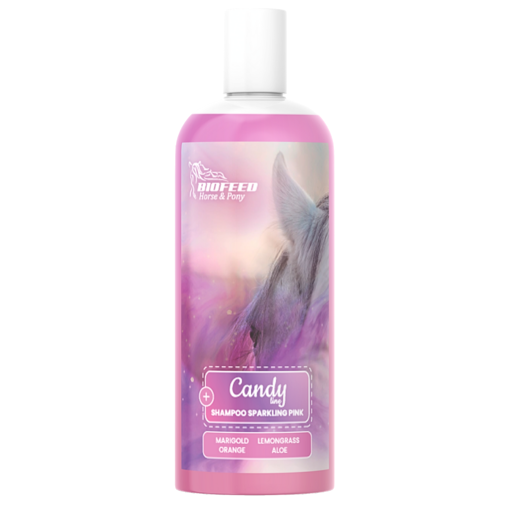 Candy Shampoo Sparkling Pink – różowy szampon dla koni z ekstraktem z kwiatu nagietka lekarskiego, sokiem z liści aloesu, olejku z liści trawy cytrynowej i wyciągu z owoców pomarańczy: