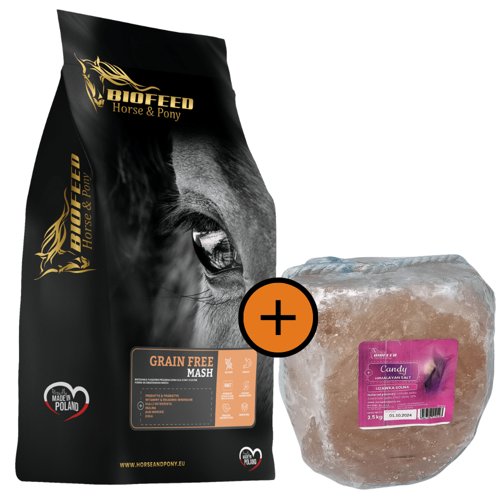 ZESTAW: Mesz dla koni bezzbożowy BIOFEED Horse & Pony Grain Free Mash 20 kg + lizawka Himalayan Salt 3,5 kg